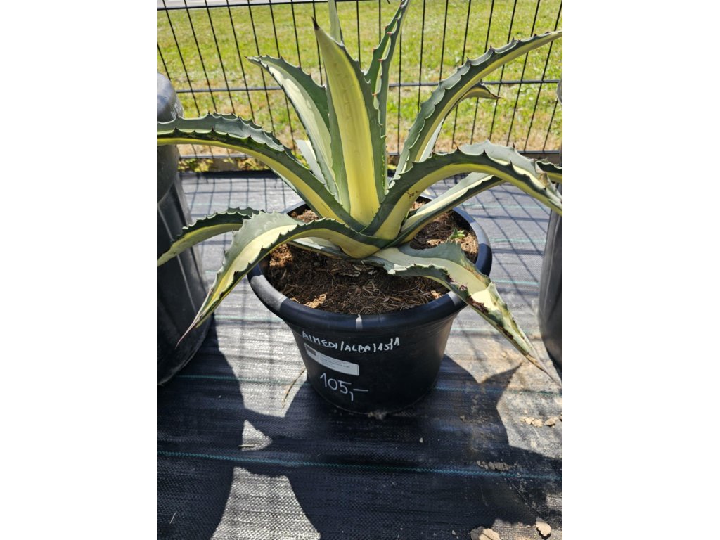 Agave americana 'Mediopicta Alba' je nádherný panašovaný kultivar ikonickej agávy, známy svojimi širokými striebristo zelenými listami s krémovobielym stredovým pruhom. Tento druh patrí medzi najvýraznejšie okrasné agávy a je častou dominantou výsadieb v suchých záhradách alebo vo veľkých nádobách. Je o niečo menšia ako typická Agave americana, čo ju robí vhodnejšou na pestovanie aj v menších priestoroch.
