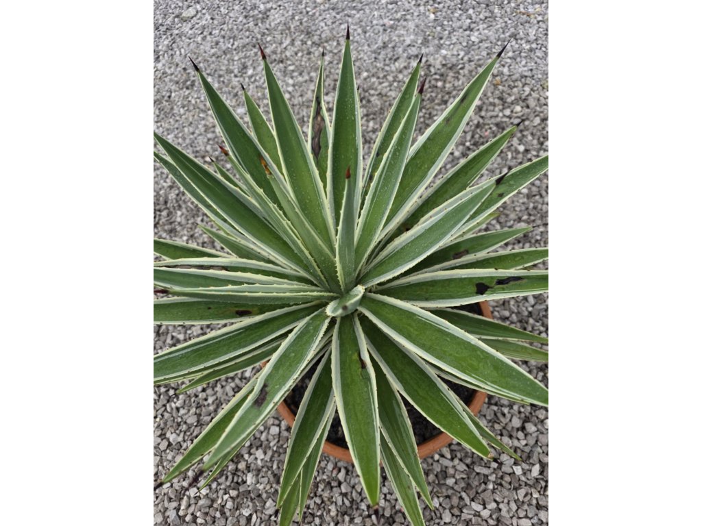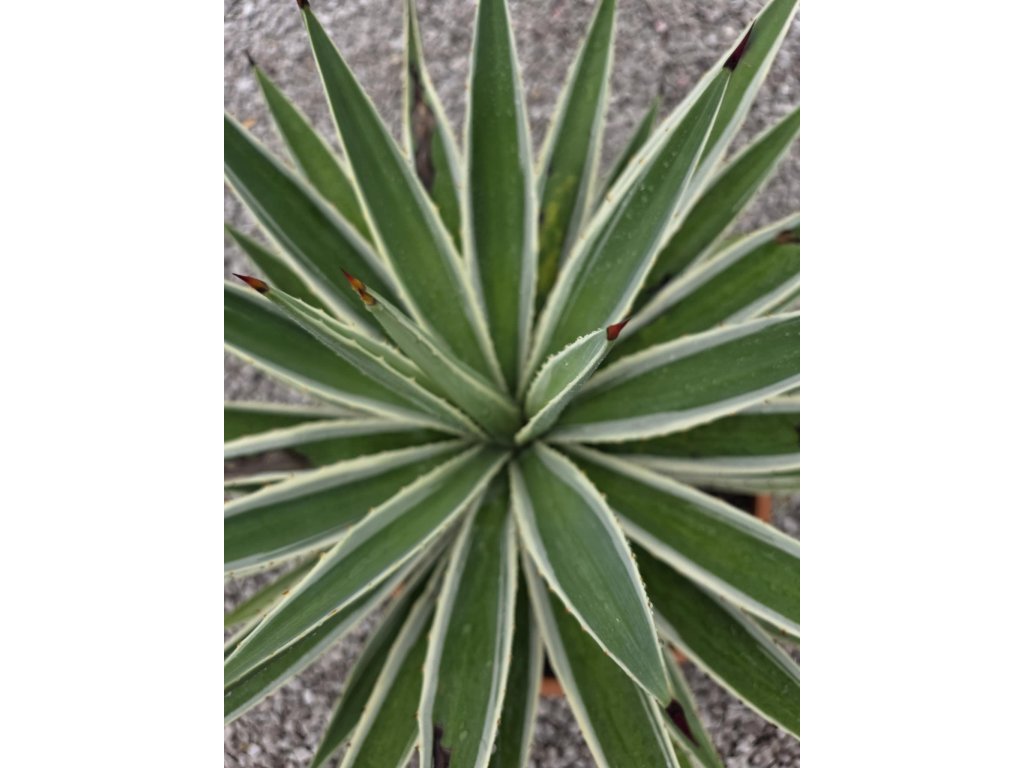 Agave angustifolia 'Variegata', známa ako panašovaná úzkolistá agáva, je suchomilná sukulentná rastlina pochádzajúca zo Strednej Ameriky a Mexika. Vytvára kompaktnú, symetrickú ružicu úzkych listov, ktoré majú výrazné krémovo-biele okraje a sú zakončené ostrými tŕňmi. Táto odroda je výnimočne dekoratívna a často sa využíva v suchých záhradách alebo ako okrasná rastlina v kvetináčoch.