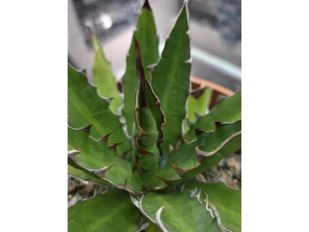 Rastlina vytvára kompaktnú až stredne veľkú ružicu tuhých, mäsitých listov zeleného až sivasto zeleného sfarbenia. Okraje listov sú vybavené drobnými až stredne výraznými ostňami a zakončené pevným terminálnym tŕňom. Celkový habitus pôsobí čisto, symetricky a prirodzene.