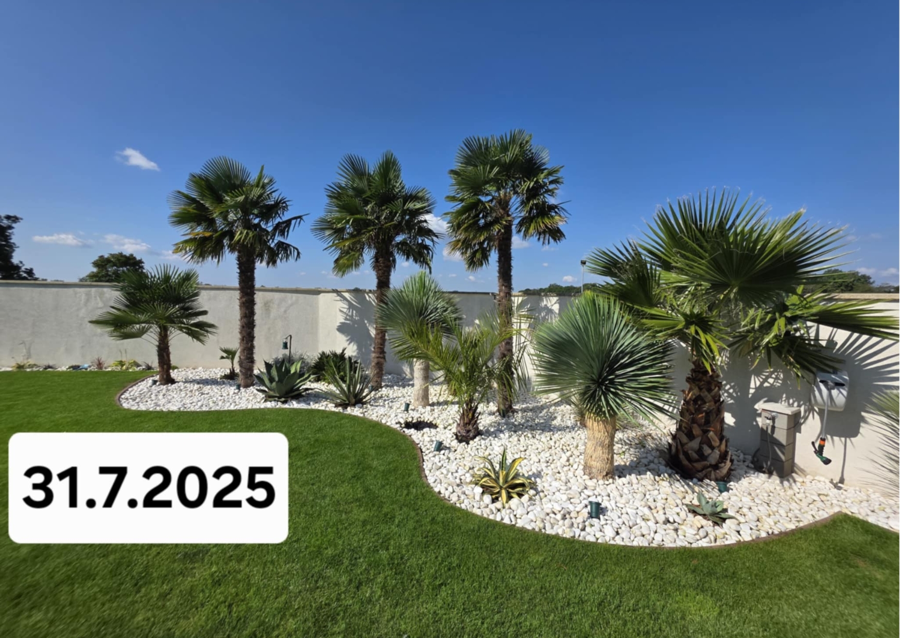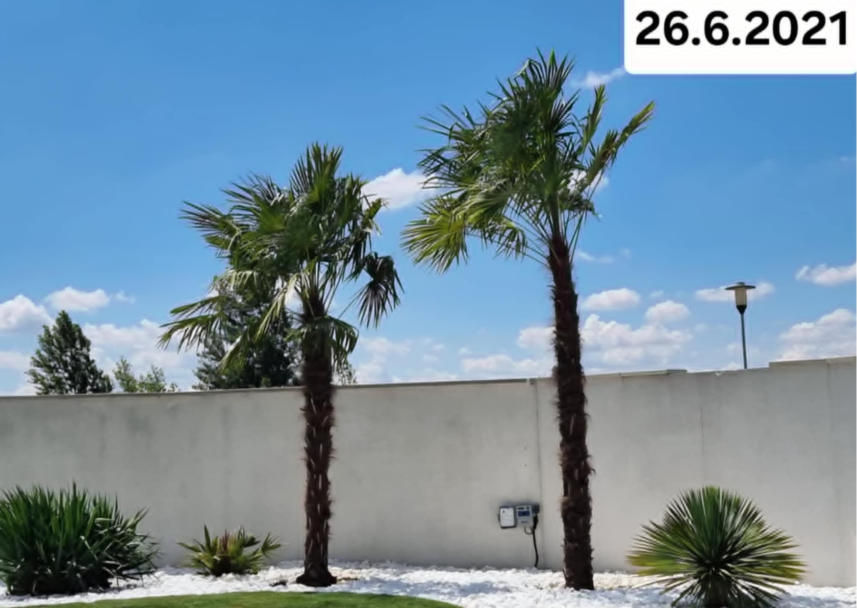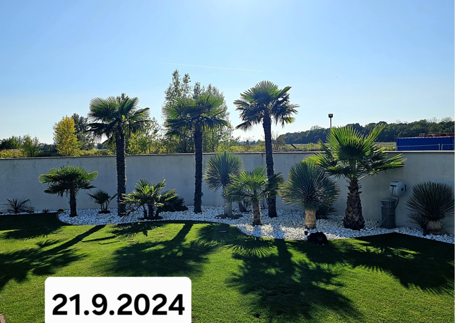 Tieto dve palmy Trachycarpus fortunei sú naše úplne prvé, ktoré sme vysadili do voľnej pôdy – konkrétne na jar 2017 priamo do budúceho trávnika. Od začiatku dostávali neprevidelnú zálievku, neskôr pravidelnú rannú závlahu z postrekovača určeného pre trávnik. Prvé roky bol ich vývoj pomalší, no veľmi stabilný. Sledovať ich rast bolo pre nás potvrdením, že pri správnej výsadbe a aspoň minimálnej starostlivosti môže palma bez problémov rásť aj v našich podmienkach.