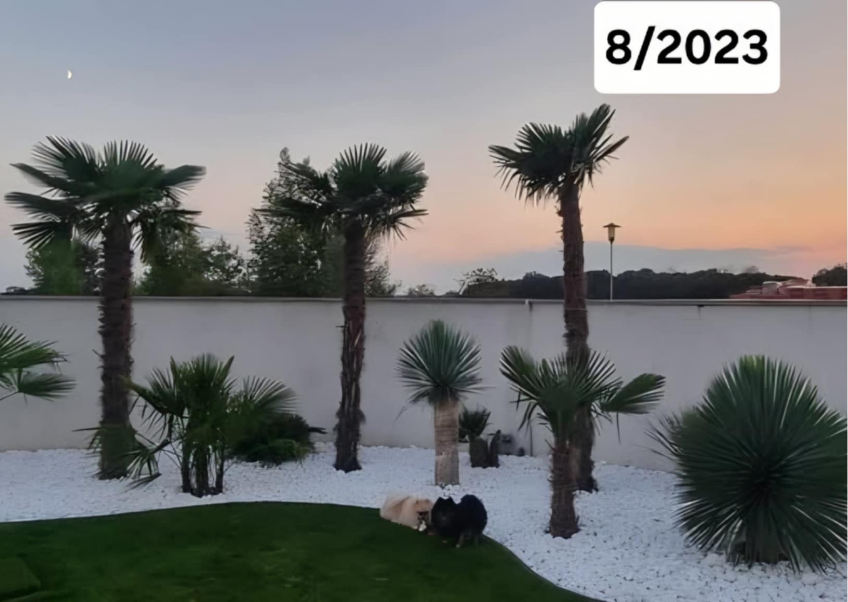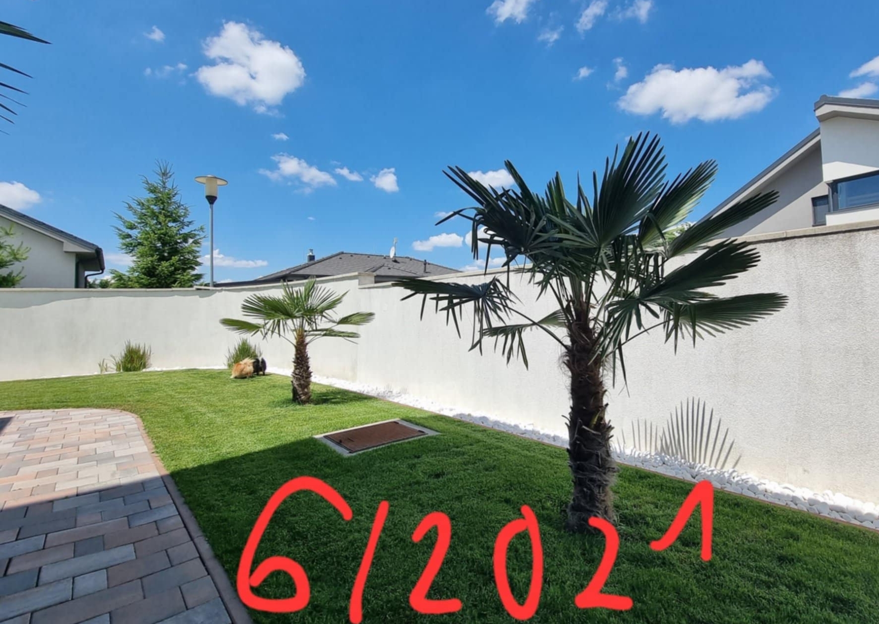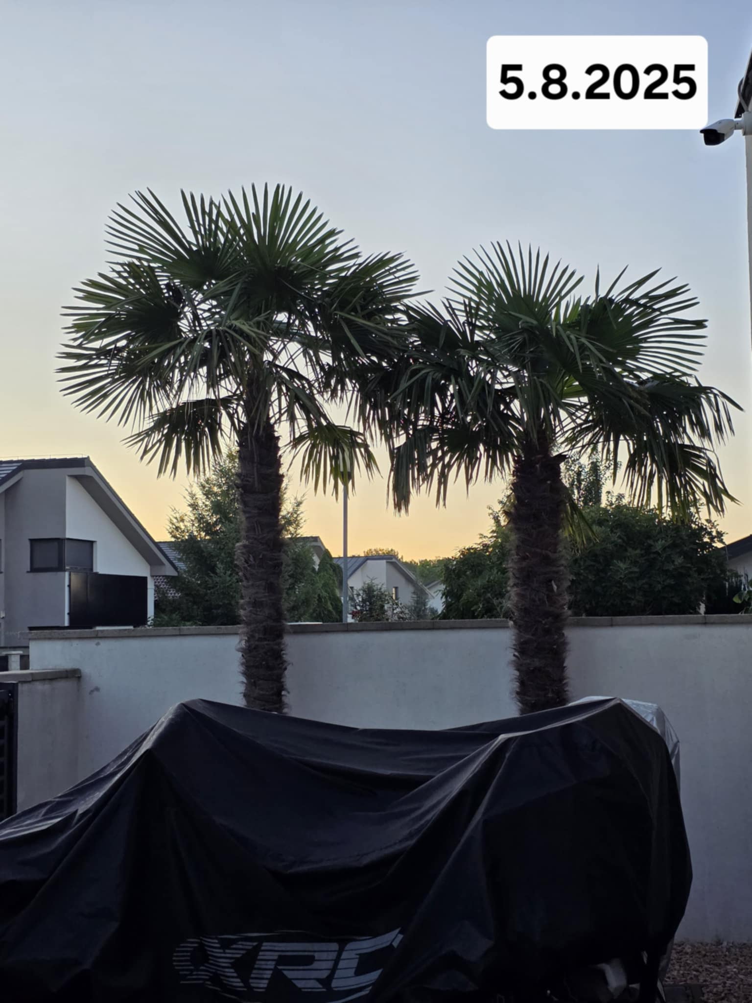 Tieto dve palmy Trachycarpus fortunei sú naše úplne prvé, ktoré sme vysadili do voľnej pôdy – konkrétne na jar 2017 priamo do budúceho trávnika. Od začiatku dostávali neprevidelnú zálievku, neskôr pravidelnú rannú závlahu z postrekovača určeného pre trávnik. Prvé roky bol ich vývoj pomalší, no veľmi stabilný. Sledovať ich rast bolo pre nás potvrdením, že pri správnej výsadbe a aspoň minimálnej starostlivosti môže palma bez problémov rásť aj v našich podmienkach.