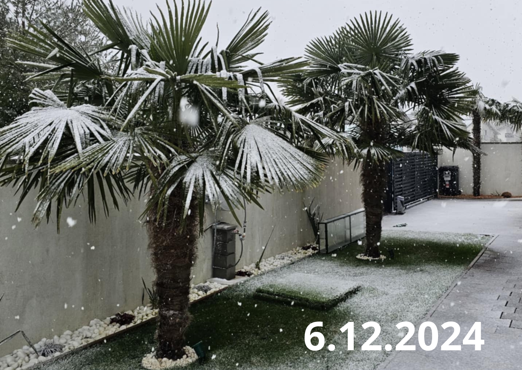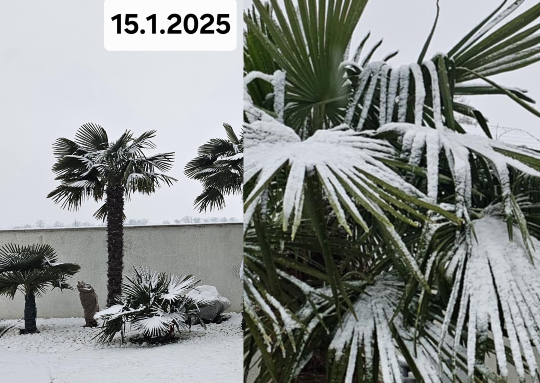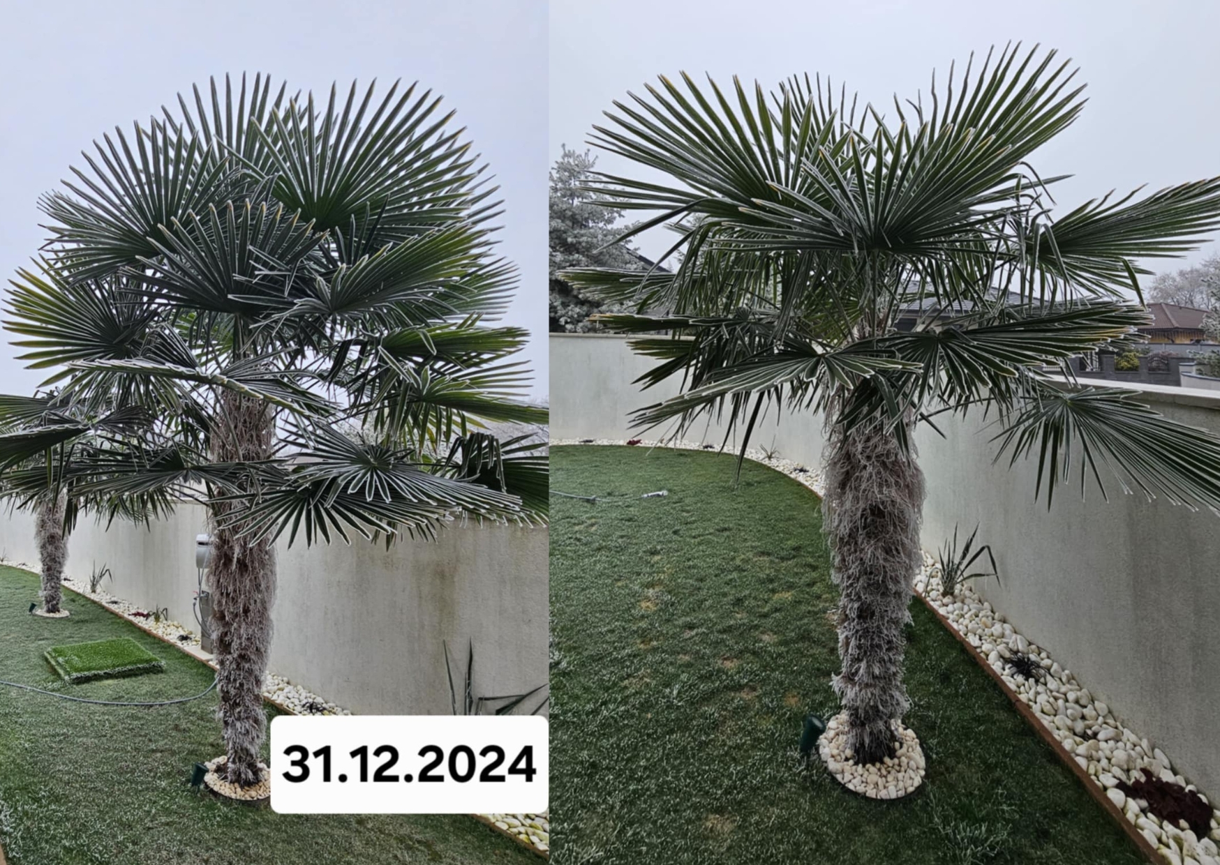 Tieto dve palmy Trachycarpus fortunei sme vysadili 30. 8. 2023 v stave, ktorý bol na prvý pohľad znepokojujúci – listy boli vytiahnuté, tiahle, mäkké a s oslabenými pletivami. Prvý rok sa im veľmi nedarilo, listy zostávali slabé a bez vitality. Až počas druhého vegetačného obdobia sa ich stav výrazne zlepšil – nové listy boli pevné, tmavozelené a zdravo vyzerajúce. Tento pokrok krásne dokumentujú fotky nižšie: