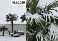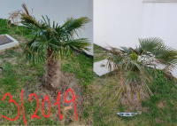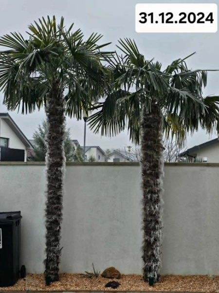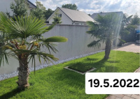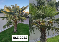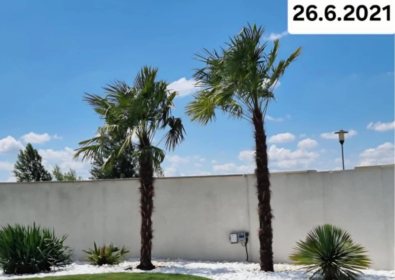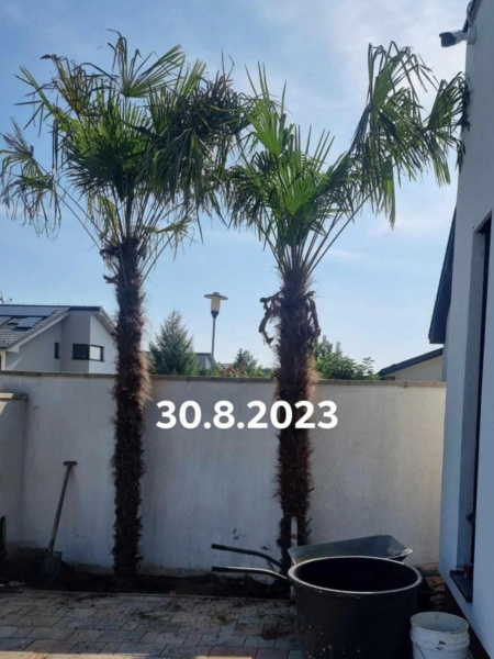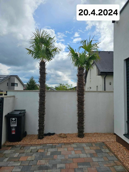 Tieto tri Trachycarpus fortunei boli vysadené v roku 2021 u nás doma pri Bratislave. Je dôležité zdôrazniť, že rastliny neboli kupované v črepníkoch, ale išlo o vykopané baly s minimálnym koreňovým systémom – teda s oveľa náročnejším štartom. Nikdy neboli chránené pred mrazmi.