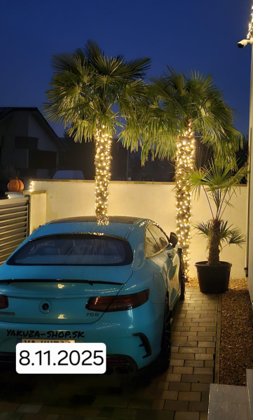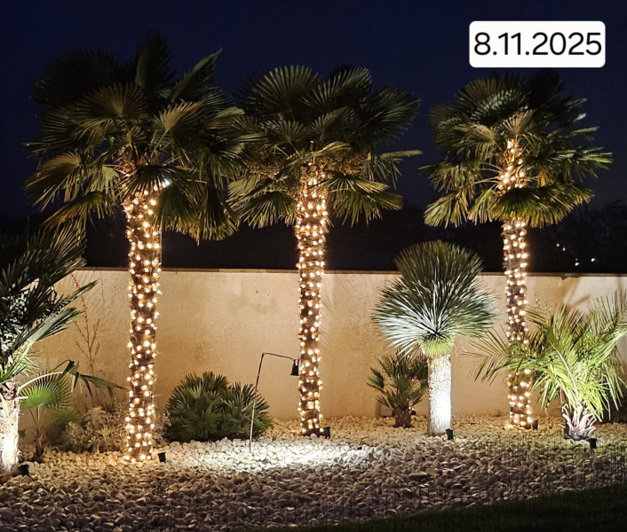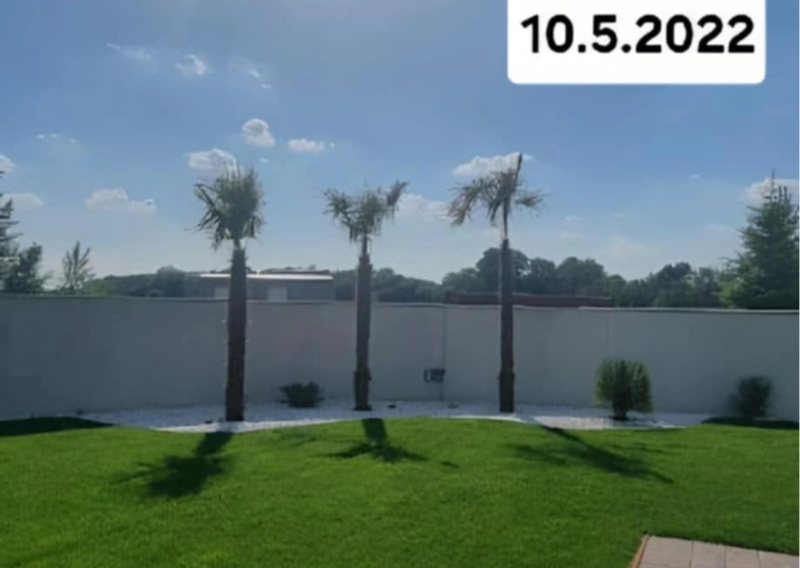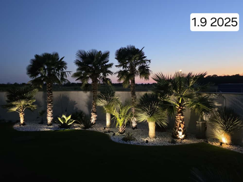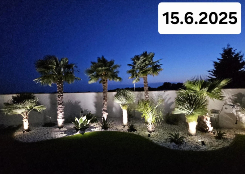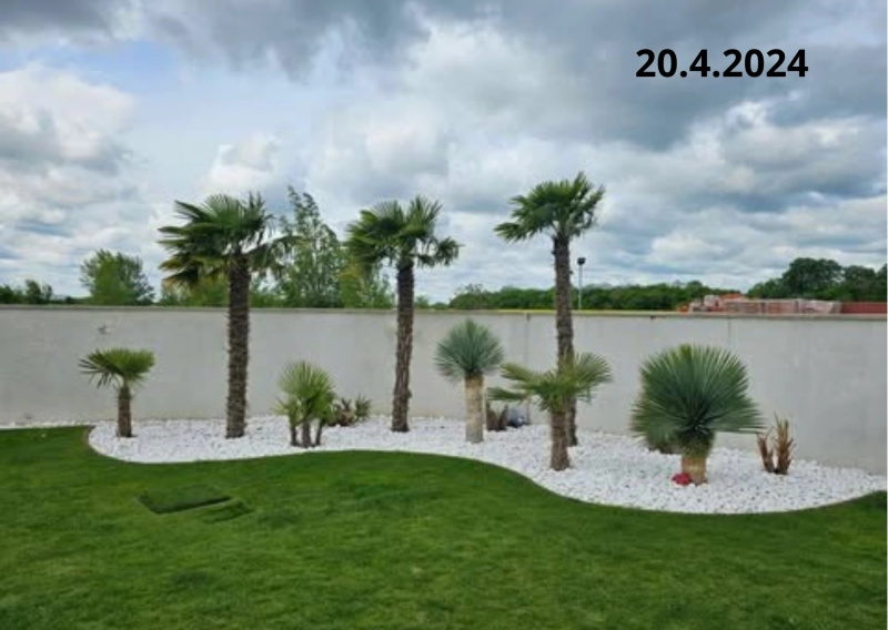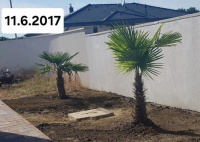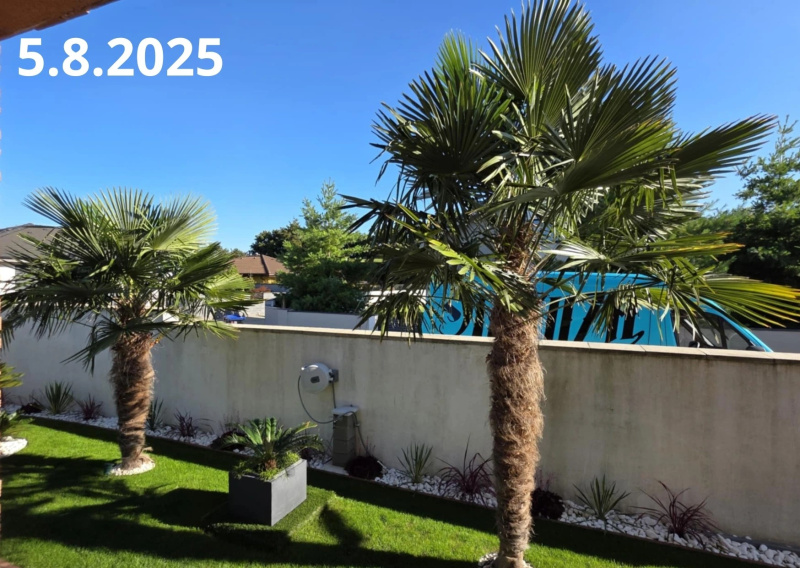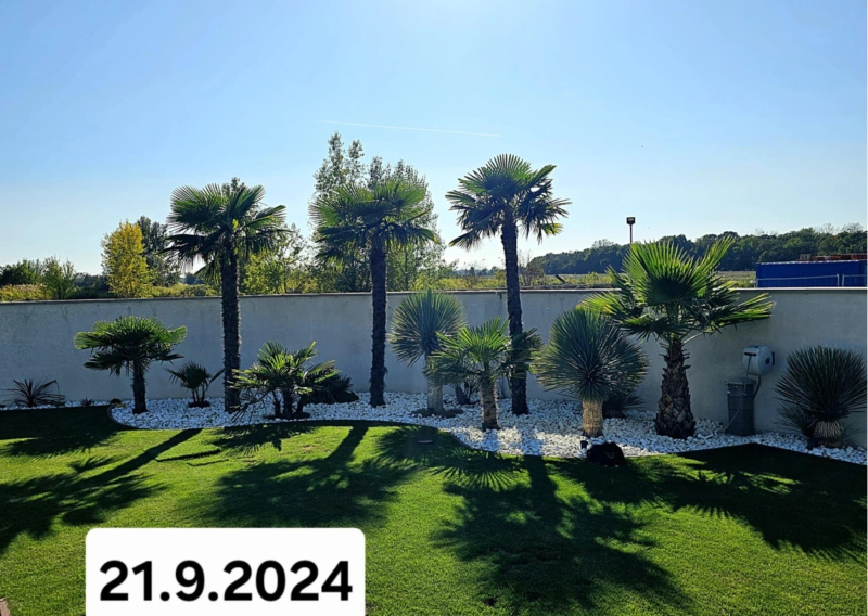 Tieto dve palmy Trachycarpus fortunei sú naše úplne prvé, ktoré sme vysadili do voľnej pôdy – konkrétne na jar 2017 priamo do budúceho trávnika. Od začiatku dostávali neprevidelnú zálievku, neskôr pravidelnú rannú závlahu z postrekovača určeného pre trávnik. Prvé roky bol ich vývoj pomalší, no veľmi stabilný. Sledovať ich rast bolo pre nás potvrdením, že pri správnej výsadbe a aspoň minimálnej starostlivosti môže palma bez problémov rásť aj v našich podmienkach.