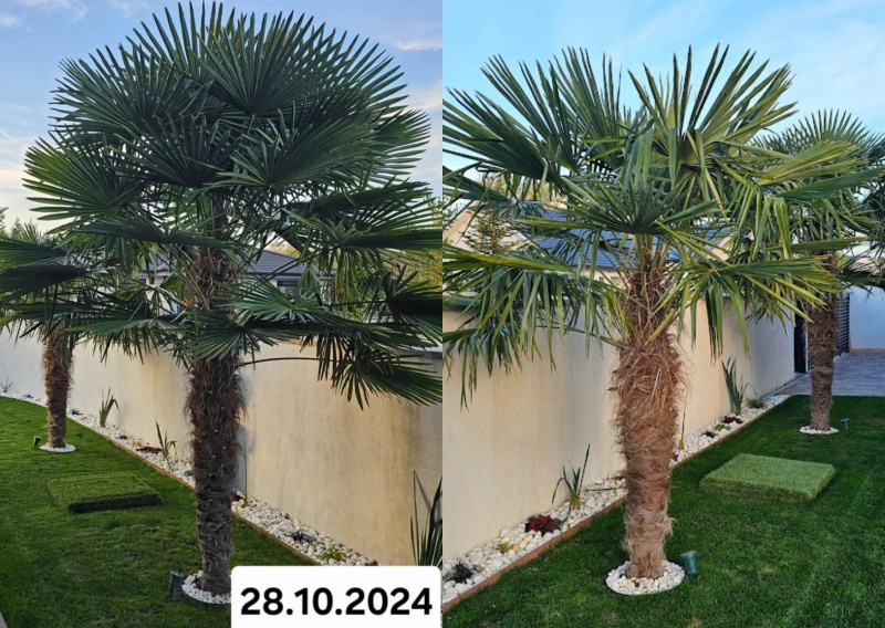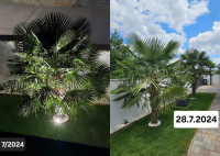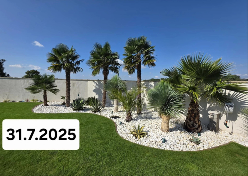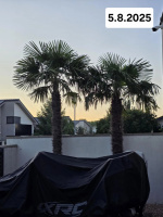 🗓️ 5. 8. 2025 – zdravé, spevnené listy a prirodzený tvar korunyReálny dôkaz, že aj palma v zlom východiskovom stave sa pri správnej starostlivosti dokáže krásne zregenerovať.Tieto palmy sú vysadené pri plote – bez pravidelnej zálievky, zalievané sú len prirodzeným dažďom a vodu prijímajú len vo forme zálievky s hnojivom. Napriek tomu prospievajú veľmi dobre a sú dôkazom, že palma sa dokáže prispôsobiť aj menej ideálnym podmienkam.