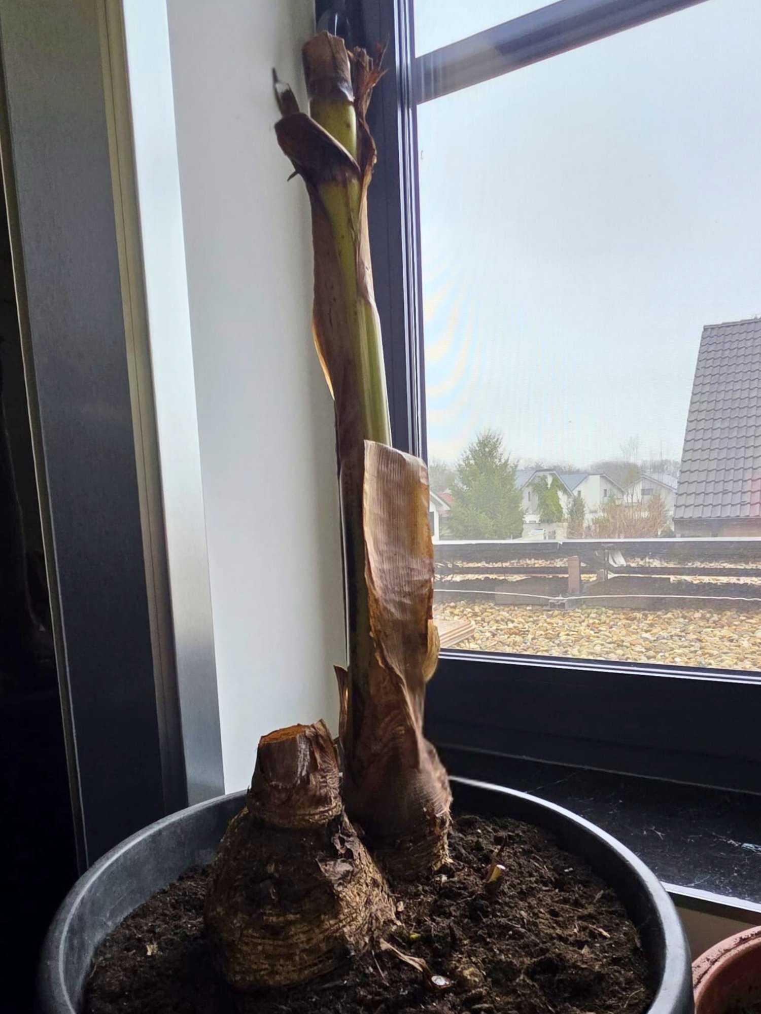 Musa basjoo zimovaná pri približne +12 °C bez zálievky. Stav v deň presunu do interiéru pod pestovateľské lampy (22 °C). Listy počas zimy odumreli, rozhodujúci je stav bázy a podzemku.