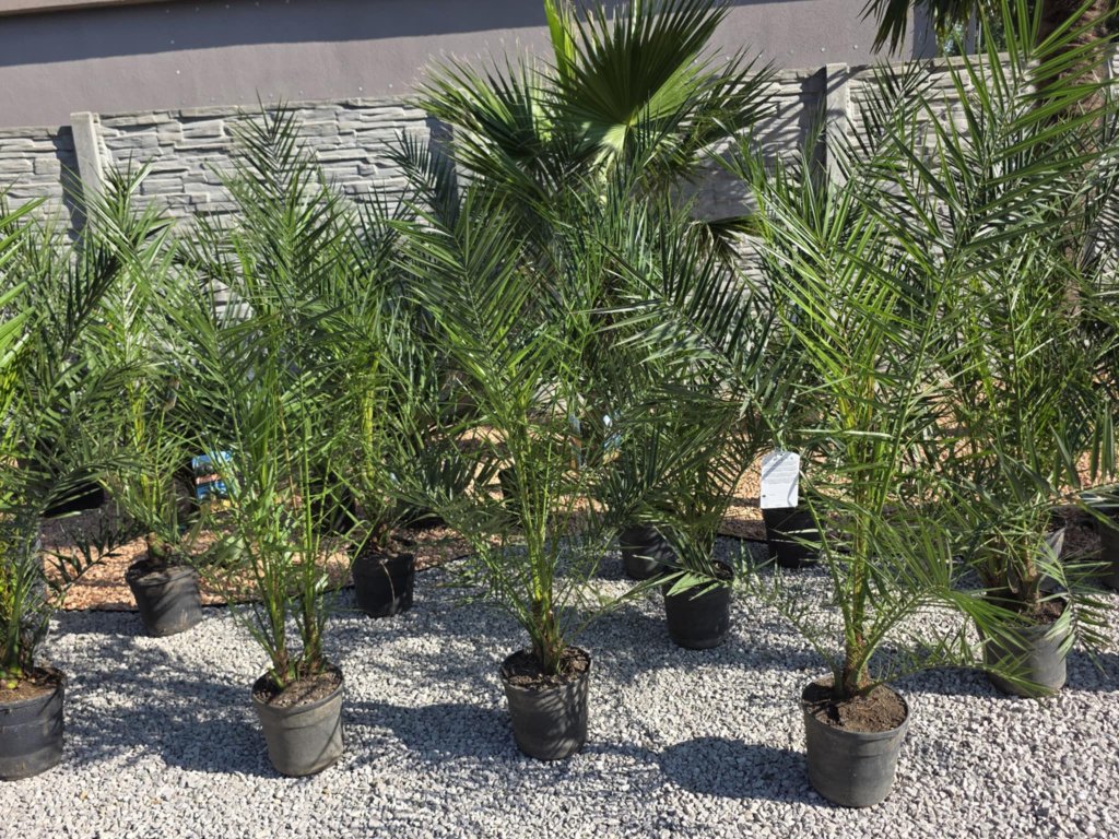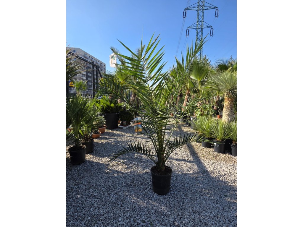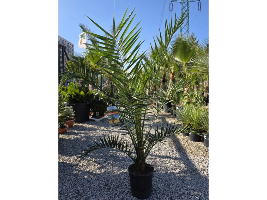 Phoenix canariensis, známy ako kanárska datľová palma, patrí medzi najikonickejšie palmy Stredomoria a subtropických oblastí. Vyniká svojím hrubým, robustným kmeňom a veľkou korunou perovitých listov, ktoré môžu dosiahnuť dĺžku až 5 metrov. Táto palma je veľmi odolná voči suchu a preferuje teplé, slnečné stanovištia. V miernych oblastiach sa dá pestovať aj v nádobách, pričom pri správnej starostlivosti vytvára exotickú atmosféru v záhradách, na terasách alebo v interiéroch.