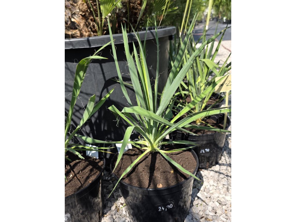 Vzhľad: Výrazná architektonická rastlina s tuhými mečovitými listami, typickými bielymi vláknami a vysokým letným kvetenstvom